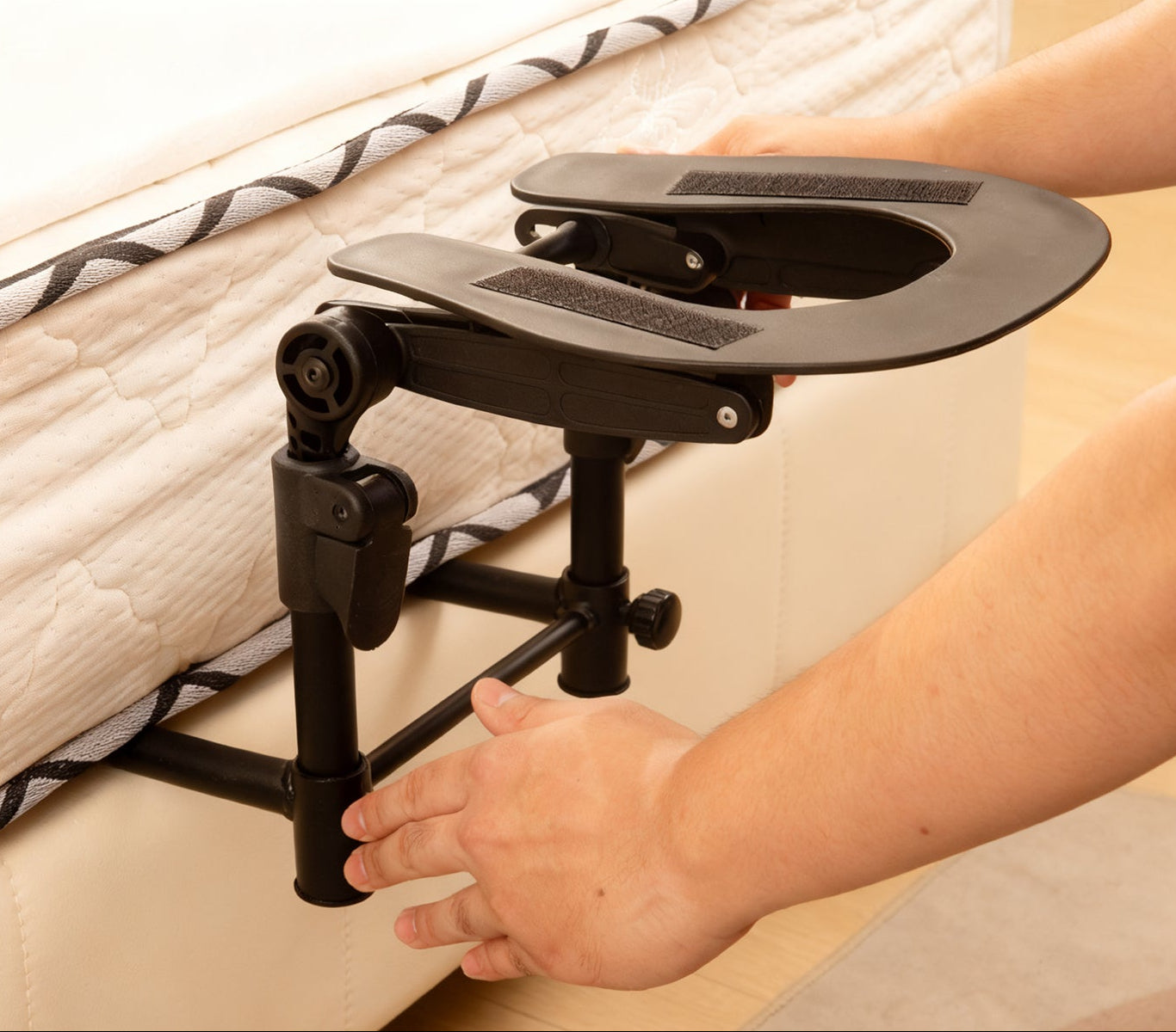 Needs to be slid under the mattress to use.Compatible with mattresses 6″–17″ thick. The support frame measures 10.5″ x 16″.